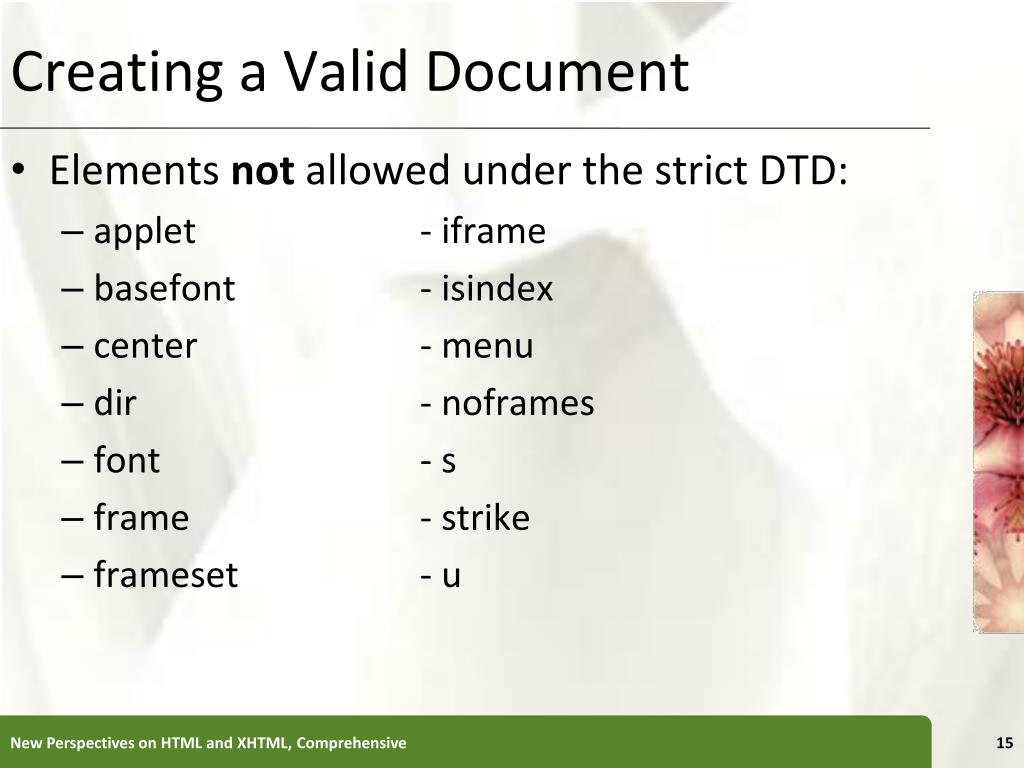Creating a Valid Document • Elements not allowed under the strict DTD: • applet - iframe • basefont - isindex • center - menu • dir - noframes • font - s • frame - strike • frameset - u New Perspectives on HTML and XHTML, Comprehensive