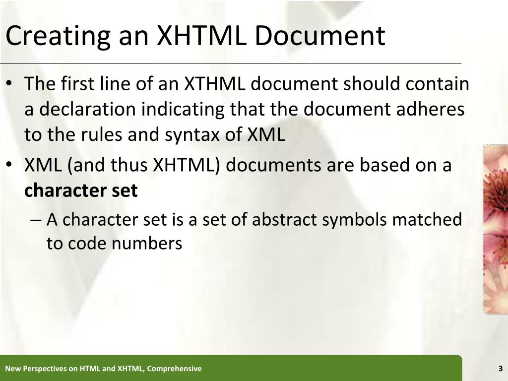 Creating an XHTML Document • The first line of an XTHML document should contain a declaration indicating that the document adheres to the rules and syntax of XML • XML (and thus XHTML) documents are based on a character set • A character set is a set of abstract symbols matched to code numbers New Perspectives on HTML and XHTML, Comprehensive