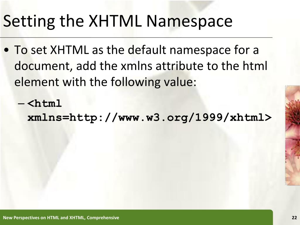 Setting the XHTML Namespace • To set XHTML as the default namespace for a document, add the xmlns attribute to the html element with the following value: • <html xmlns=http://www.w3.org/1999/xhtml> New Perspectives on HTML and XHTML, Comprehensive
