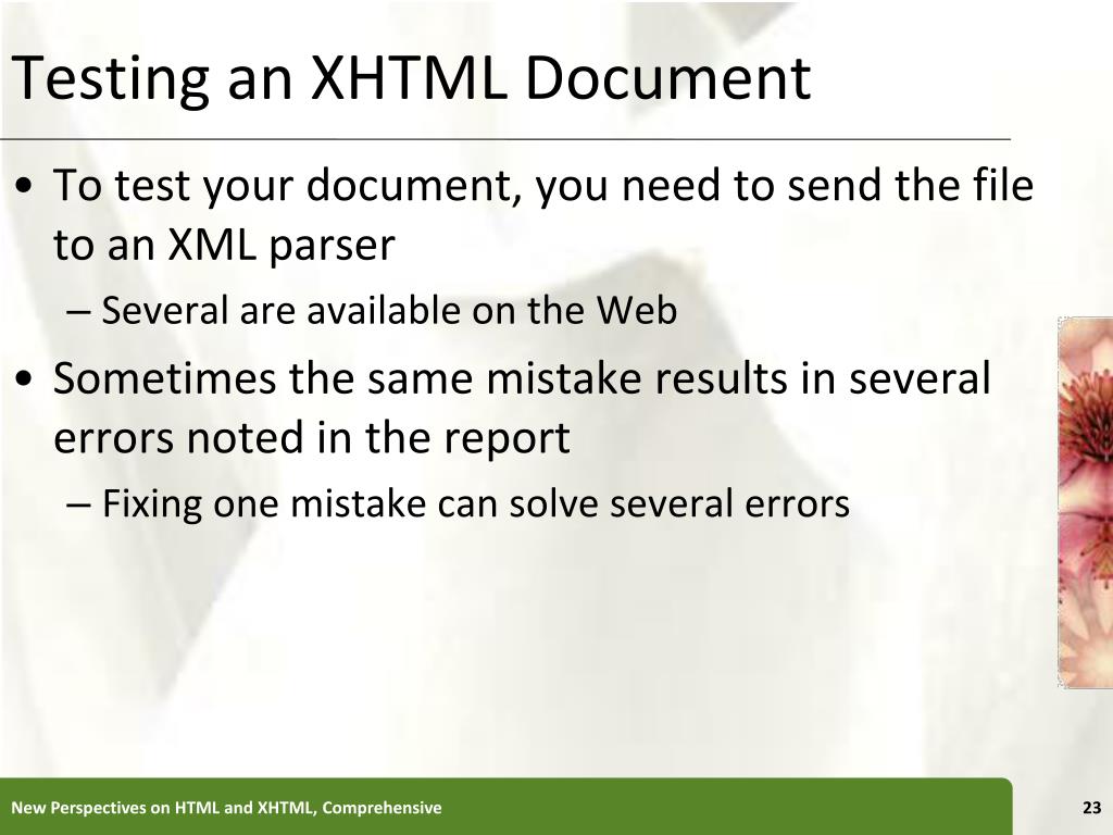 Testing an XHTML Document • To test your document, you need to send the file to an XML parser • Several are available on the Web • Sometimes the same mistake results in several errors noted in the report • Fixing one mistake can solve several errors New Perspectives on HTML and XHTML, Comprehensive