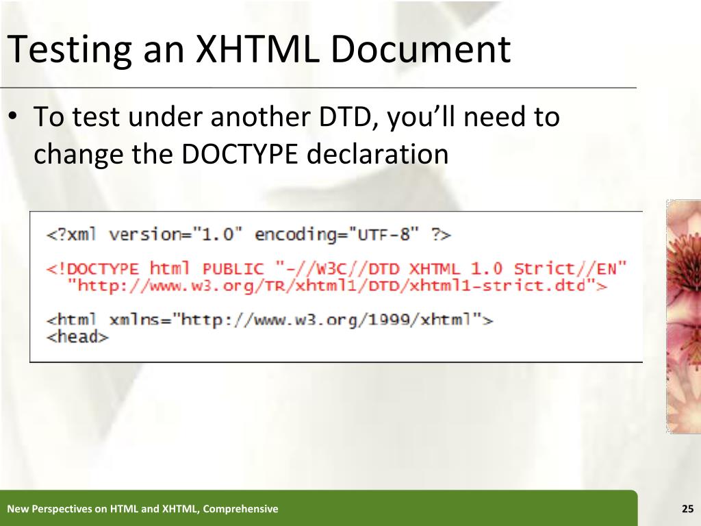 Testing an XHTML Document • To test under another DTD, you’ll need to change the DOCTYPE declaration New Perspectives on HTML and XHTML, Comprehensive