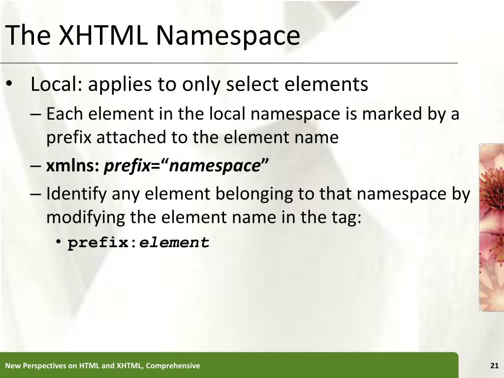 The XHTML Namespace • Local: applies to only select elements • Each element in the local namespace is marked by a prefix attached to the element name • xmlns: prefix=“namespace” • Identify any element belonging to that namespace by modifying the element name in the tag: • prefix:element New Perspectives on HTML and XHTML, Comprehensive