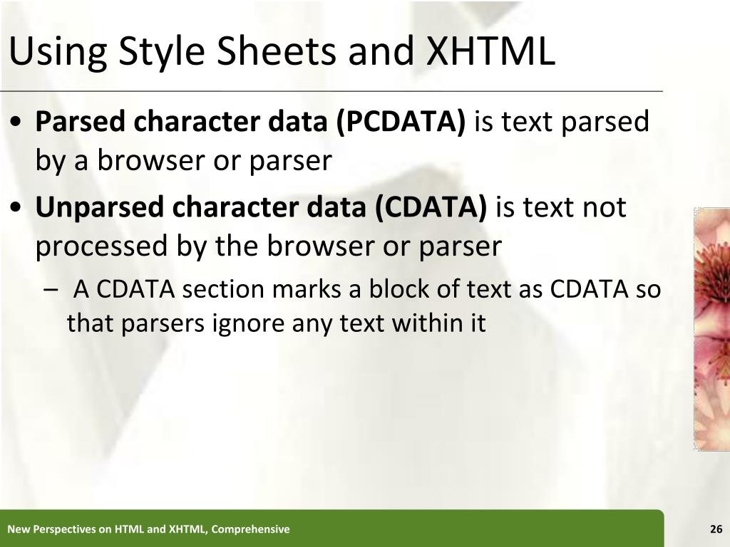 Using Style Sheets and XHTML • Parsed character data (PCDATA) is text parsed by a browser or parser • Unparsed character data (CDATA) is text not processed by the browser or parser • A CDATA section marks a block of text as CDATA so that parsers ignore any text within it New Perspectives on HTML and XHTML, Comprehensive