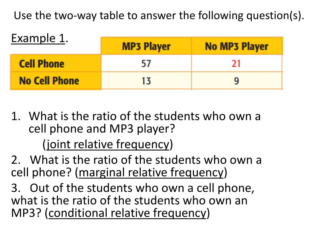 Use the two-way table to answer the following question(s). Example 1. • What is the ratio of the students who own a cell phone and MP3 player? (joint relative frequency) 2. What is the ratio of the students who own a cell phone? (marginal relative frequency) 3. Out of the students who own a cell phone, what is the ratio of the students who own an MP3? (conditional relative frequency)