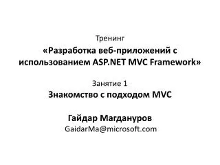 Тренинг«Разработка веб-приложений с использованием ASP.NET MVC Framework» Занятие 1 Знакомство с подходом MVC Гайдар Магдануров GaidarMa@microsoft.com