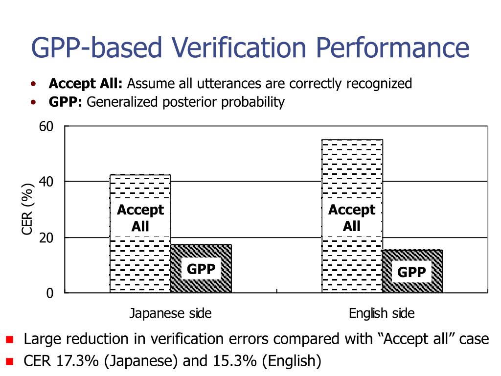 GPP-based Verification Performance • Accept All: Assume all utterances are correctly recognized • GPP: Generalized posterior probability Accept All Accept All GPP GPP • Large reduction in verification errors compared with “Accept all” case • CER 17.3% (Japanese) and 15.3% (English)