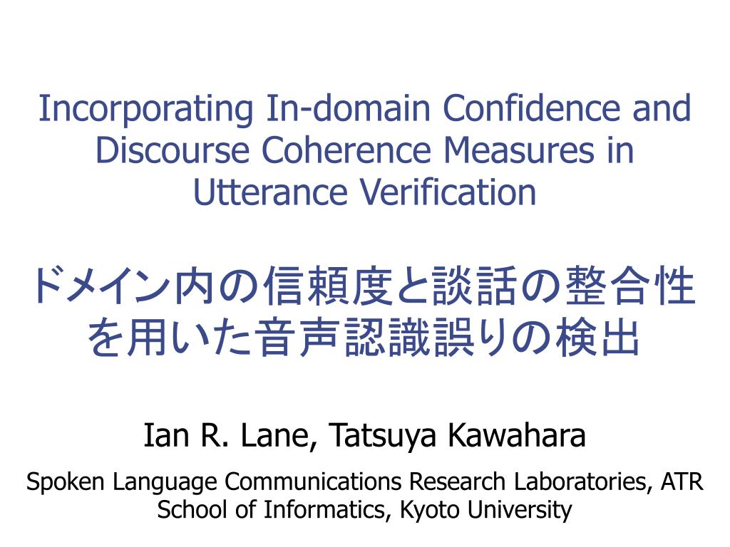 Incorporating In-domain Confidence and Discourse Coherence Measures in Utterance Verificationドメイン内の信頼度と談話の整合性を用いた音声認識誤りの検出 Ian R. Lane, Tatsuya Kawahara Spoken Language Communications Research Laboratories, ATR School of Informatics, Kyoto University