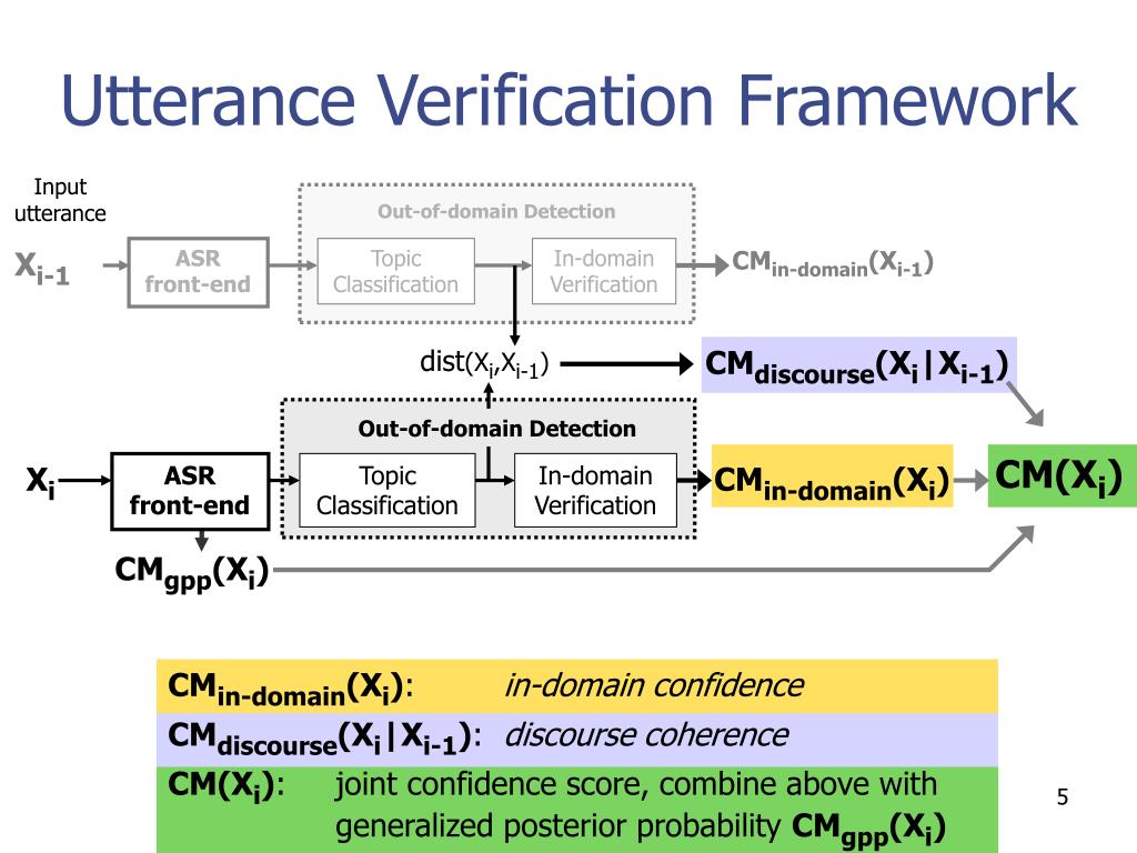 Joint Confidence Score where • For utterance verification compare CM(Xi) to threshold () • Model weights (gpp, in-domain, discourse), and threshold () trained on development set