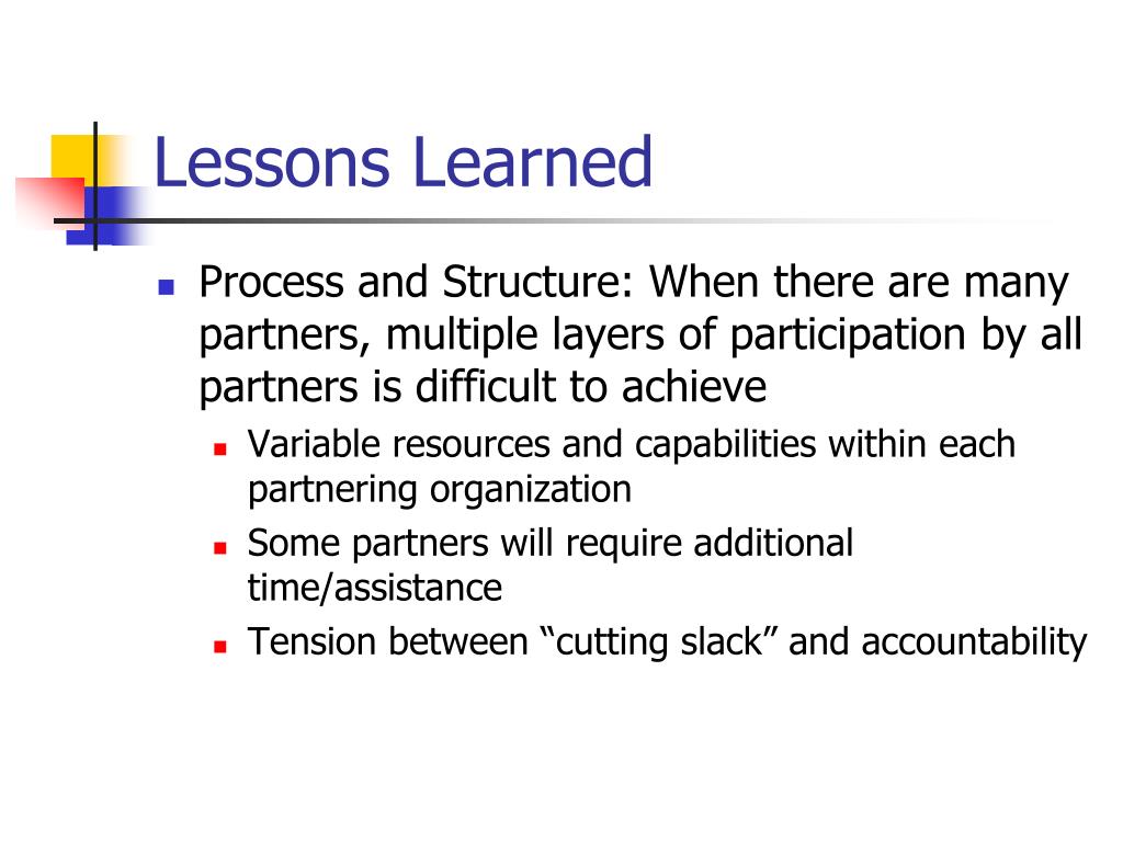 Lessons Learned • Process and Structure: When there are many partners, multiple layers of participation by all partners is difficult to achieve • Variable resources and capabilities within each partnering organization • Some partners will require additional time/assistance • Tension between “cutting slack” and accountability
