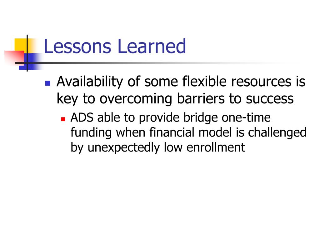 Lessons Learned • Availability of some flexible resourcesis key to overcoming barriers to success • ADS able to provide bridge one-timefunding when financial model is challenged by unexpectedly low enrollment