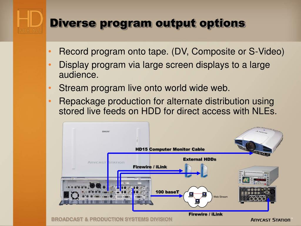 ™ Multi-format seamless switching • The Anycast Station is unique in that it handles multiple video formats seamlessly and simultaneously. Sources can be: • Composite video • S-Video • DV video (with embedded audio over Firewire) • PC RGB • SDI (with optional BKAW-580) • HD Component Analog (BKAW-560 & v2.0 announced) • HD-SDI (BKAW-590 & v2.1 announced) • Image files (JPG, TIF, Targa, BMP) (All video sources can be NTSC and/or PAL)