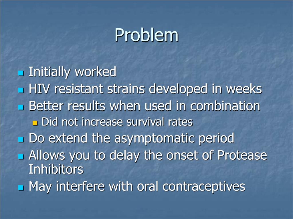 Problem • Initially worked • HIV resistant strains developed in weeks • Better results when used in combination • Did not increase survival rates • Do extend the asymptomatic period • Allows you to delay the onset of Protease Inhibitors • May interfere with oral contraceptives