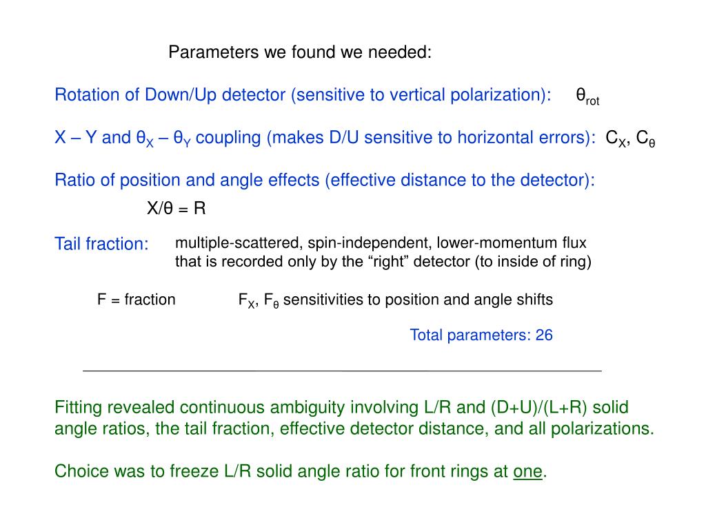 Parameters we found we needed: Rotation of Down/Up detector (sensitive to vertical polarization): θrot X – Y and θX – θY coupling (makes D/U sensitive to horizontal errors): CX, Cθ Ratio of position and angle effects (effective distance to the detector): X/θ = R Tail fraction: multiple-scattered, spin-independent, lower-momentum flux that is recorded only by the “right” detector (to inside of ring) F = fraction FX, Fθ sensitivities to position and angle shifts Total parameters: 26 Fitting revealed continuous ambiguity involving L/R and (D+U)/(L+R) solid angle ratios, the tail fraction, effective detector distance, and all polarizations. Choice was to freeze L/R solid angle ratio for front rings at one.