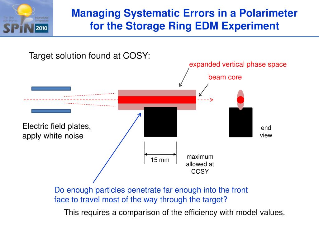 Managing Systematic Errors in a Polarimeter for the Storage Ring EDM Experiment Target solution found at COSY: expanded vertical phase space beam core Yes, front back model 5.7 4.7 data 6.8 5.9 × 10−4 Values well below ~ 1% because of thin target and loss of small angles. Electric field plates, apply white noise end view maximum allowed at COSY 15 mm Do enough particles penetrate far enough into the front face to travel most of the way through the target? This requires a comparison of the efficiency with model values.