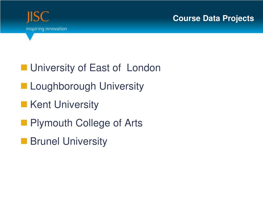 Course Data Projects • University of East of London • Loughborough University • Kent University • Plymouth College of Arts • Brunel University