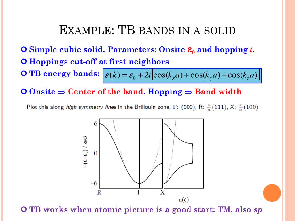 Example: TB bands in a solid • Simple cubic solid. Parameters: Onsite 0 and hopping t. • Hoppings cut-off at first neighbors • TB energy bands: • Onsite Center of the band. Hopping Band width • TB works when atomic picture is a good start: TM, also sp