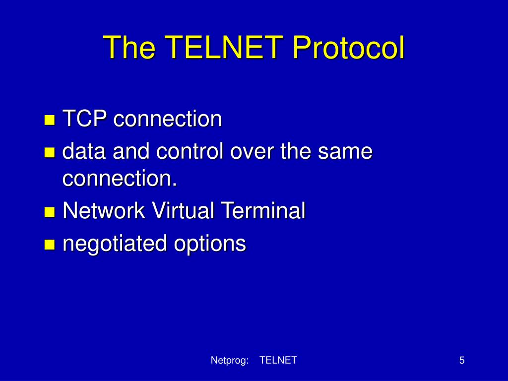 RFCs • The first RFC specifically defining Telnet was RFC 97, First Cut at a Proposed Telnet Protocol, published in February 1971. • Telnet Protocol Specification, was published as RFC 854 in May 1983. • Telnet Option Specifications, RFC 855 Netprog: TELNET