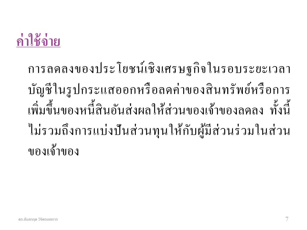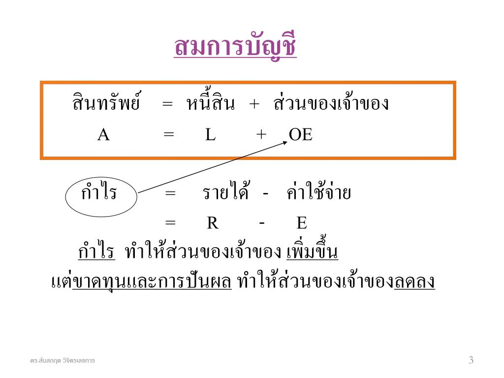 สมการบัญชี สินทรัพย์ = หนี้สิน + ส่วนของเจ้าของ A = L + OE กำไร = รายได้ - ค่าใช้จ่าย = R - E กำไร ทำให้ส่วนของเจ้าของ เพิ่มขึ้น แต่ขาดทุนและการปันผล ทำให้ส่วนของเจ้าของลดลง