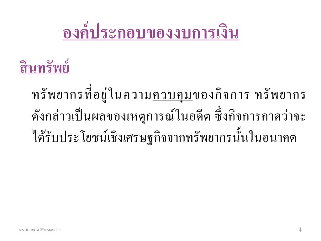 องค์ประกอบของงบการเงินองค์ประกอบของงบการเงิน สินทรัพย์ ทรัพยากรที่อยู่ในความควบคุมของกิจการ ทรัพยากรดังกล่าวเป็นผลของเหตุการณ์ในอดีต ซึ่งกิจการคาดว่าจะได้รับประโยชน์เชิงเศรษฐกิจจากทรัพยากรนั้นในอนาคต