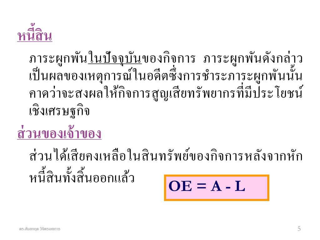 หนี้สิน ภาระผูกพันในปัจจุบันของกิจการ ภาระผูกพันดังกล่าวเป็นผลของเหตุการณ์ในอดีตซึ่งการชำระภาระผูกพันนั้นคาดว่าจะสงผลให้กิจการสูญเสียทรัพยากรที่มีประโยชน์เชิงเศรษฐกิจ ส่วนของเจ้าของ ส่วนได้เสียคงเหลือในสินทรัพย์ของกิจการหลังจากหักหนี้สินทั้งสิ้นออกแล้ว OE = A - L