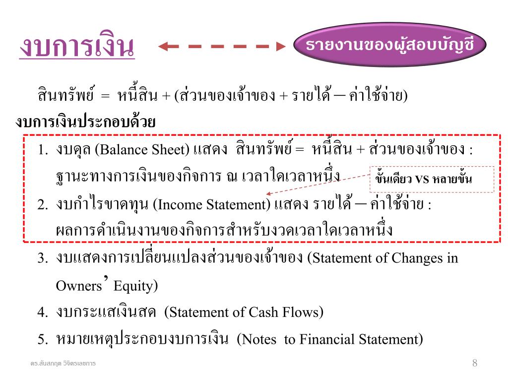 งบการเงิน รายงานของผู้สอบบัญชี สินทรัพย์ = หนี้สิน + (ส่วนของเจ้าของ + รายได้ – ค่าใช้จ่าย) งบการเงินประกอบด้วย 1. งบดุล (Balance Sheet) แสดง สินทรัพย์ = หนี้สิน + ส่วนของเจ้าของ : ฐานะทางการเงินของกิจการ ณ เวลาใดเวลาหนึ่ง 2. งบกำไรขาดทุน (Income Statement) แสดง รายได้ – ค่าใช้จ่าย : ผลการดำเนินงานของกิจการสำหรับงวดเวลาใดเวลาหนึ่ง 3. งบแสดงการเปลี่ยนแปลงส่วนของเจ้าของ (Statement of Changes in Owners’ Equity) 4. งบกระแสเงินสด (Statement of Cash Flows) 5. หมายเหตุประกอบงบการเงิน (Notes to Financial Statement) ขั้นเดียว VS หลายขั้น