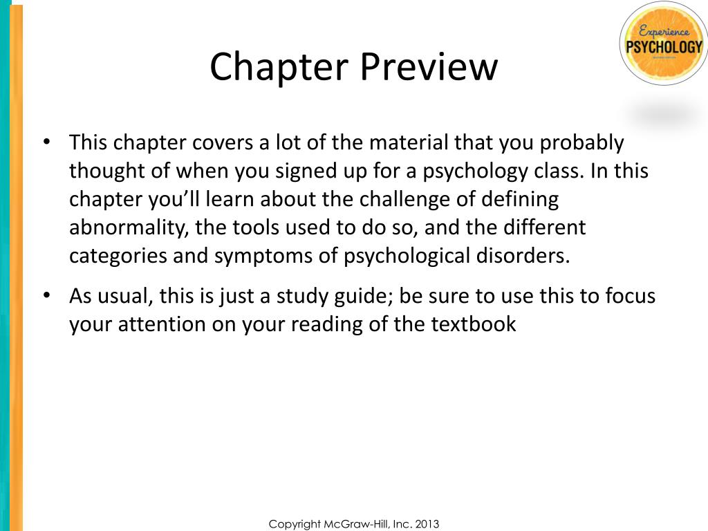 Chapter Preview • This chapter covers a lot of the material that you probably thought of when you signed up for a psychology class. In this chapter you’ll learn about the challenge of defining abnormality, the tools used to do so, and the different categories and symptoms of psychological disorders. • As usual, this is just a study guide; be sure to use this to focus your attention on your reading of the textbook