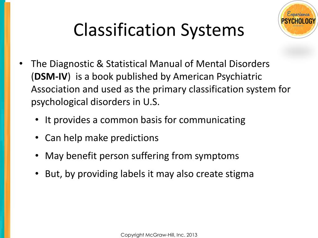 Classification Systems • The Diagnostic & Statistical Manual of Mental Disorders (DSM-IV) is a book published by American Psychiatric Association and used as the primary classification system for psychological disorders in U.S. • It provides a common basis for communicating • Can help make predictions • May benefit person suffering from symptoms • But, by providing labels it may also create stigma