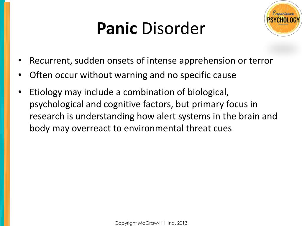Panic Disorder • Recurrent, sudden onsets of intense apprehension or terror • Often occur without warning and no specific cause • Etiology may include a combination of biological, psychological and cognitive factors, but primary focus in research is understanding how alert systems in the brain and body may overreact to environmental threat cues