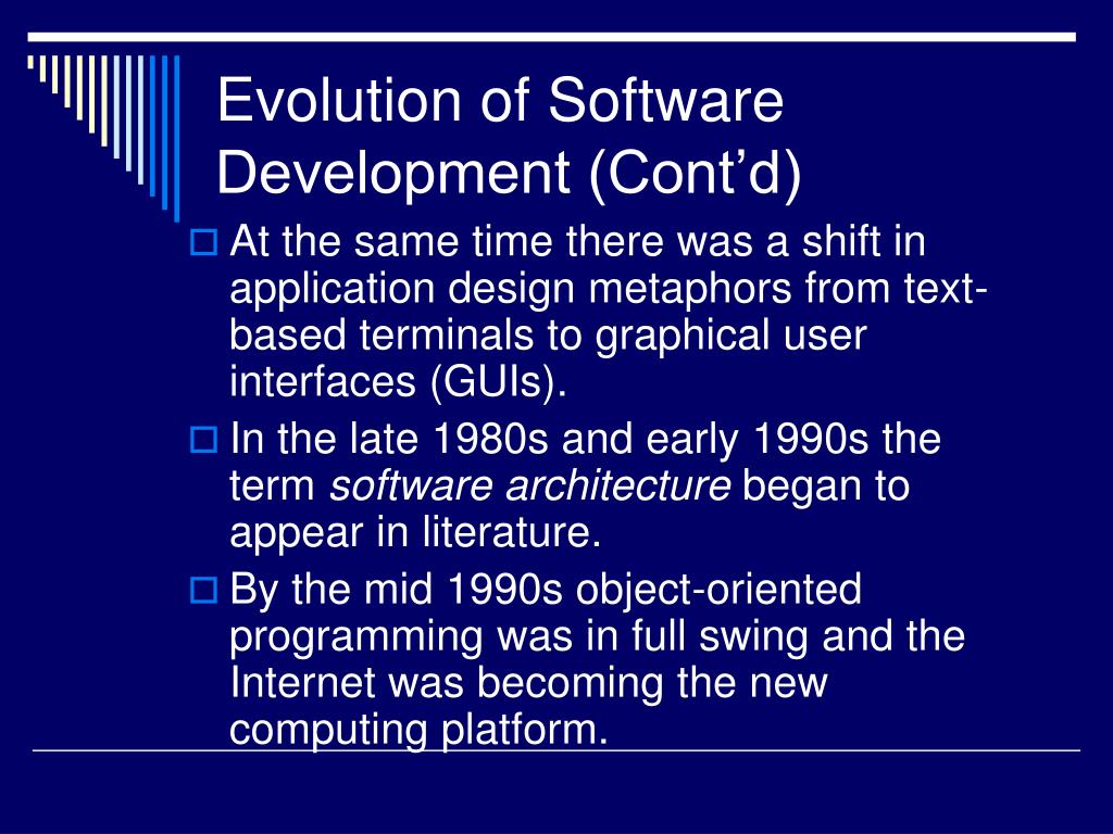 Evolution of Software Development (Cont’d) • At the same time there was a shift in application design metaphors from text-based terminals to graphical user interfaces (GUIs). • In the late 1980s and early 1990s the term software architecture began to appear in literature. • By the mid 1990s object-oriented programming was in full swing and the Internet was becoming the new computing platform.