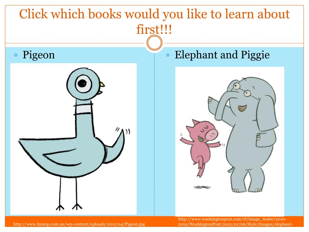 Click which books would you like to learn about first!!! http://www.washingtonpost.com/rf/image_606w/2010-2019/WashingtonPost/2012/01/06/Style/Images/elephant-piggie_3.jpg Pigeon Elephant and Piggie http://www.lmnop.com.au/wp-content/uploads/2011/04/Pigeon.jpg