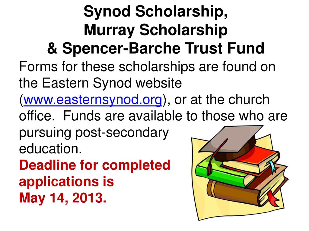 Synod Scholarship, Murray Scholarship& Spencer-Barche Trust Fund Forms for these scholarships are found on the Eastern Synod website (www.easternsynod.org), or at the church office. Funds are available to those who are pursuing post-secondary education. Deadline for completed applications is May 14, 2013.