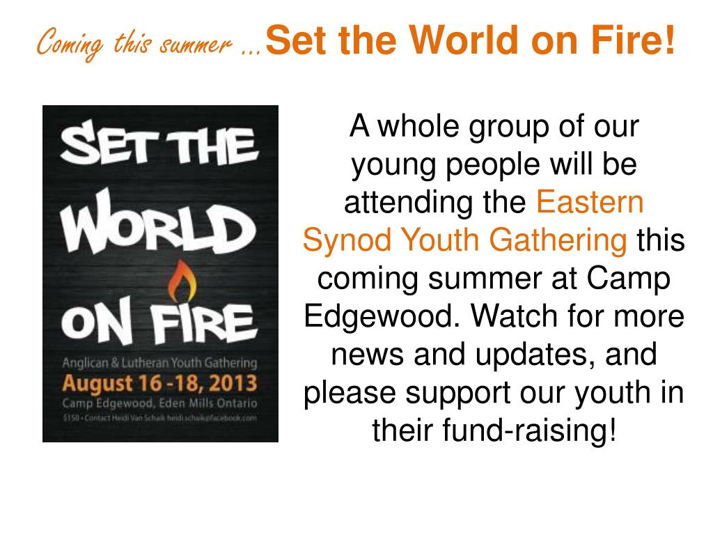 Coming this summer ...Set the World on Fire! A whole group of our young people will be attending the Eastern Synod Youth Gathering this coming summer at Camp Edgewood. Watch for more news and updates, and please support our youth in their fund-raising!