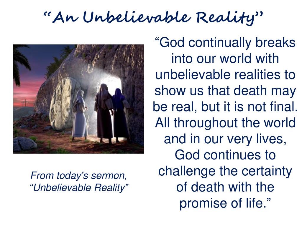 “An Unbelievable Reality” “God continually breaks into our world with unbelievable realities to show us that death may be real, but it is not final. All throughout the world and in our very lives, God continues to challenge the certainty of death with the promise of life.” From today’s sermon, “Unbelievable Reality”
