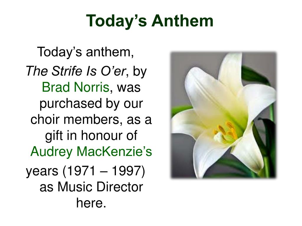 Today’s anthem, The Strife Is O’er, by Brad Norris, was purchased by our choir members, as a gift in honour of Audrey MacKenzie’s years (1971 – 1997) as Music Director here. Today’s Anthem