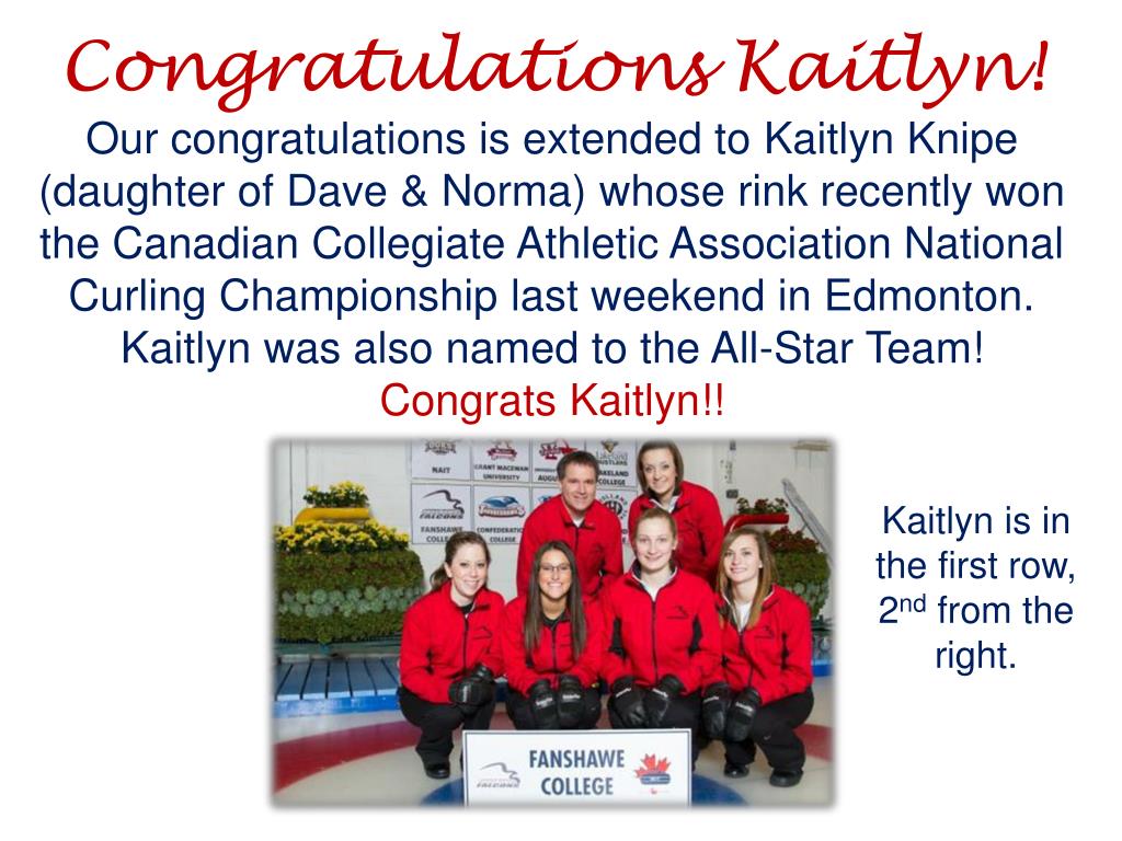 Congratulations Kaitlyn! Our congratulations is extended to KaitlynKnipe (daughter of Dave & Norma) whose rink recently won the Canadian Collegiate Athletic Association National Curling Championship last weekend in Edmonton. Kaitlyn was also named to the All-Star Team! Congrats Kaitlyn!! Kaitlyn is in the first row, 2nd from the right.