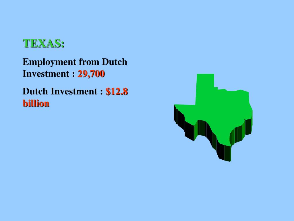 TEXAS: Employment from Dutch Investment : 29,700 Dutch Investment : $12.8 billion