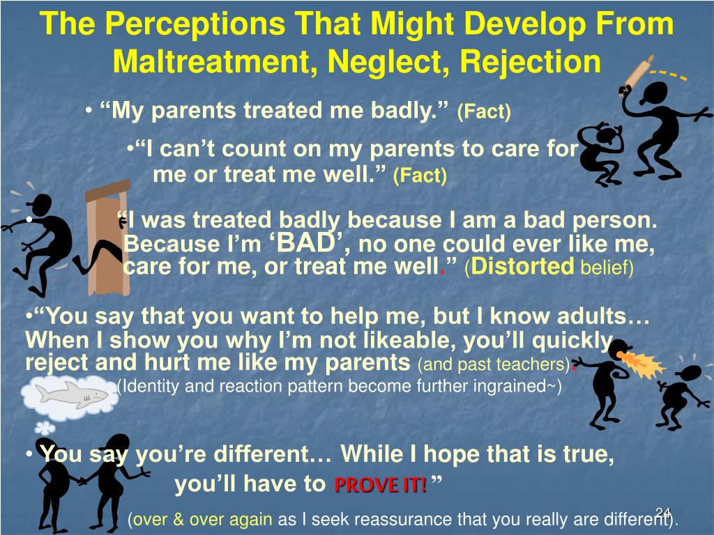 The Perceptions That Might Develop From Maltreatment, Neglect, Rejection • “My parents treated me badly.”(Fact) • “I can’t count on my parents to care for • me or treat me well.”(Fact) • “I was treated badly because I am a bad person. Because I’m ‘BAD’, no one could ever like me, care for me, or treat me well.”(Distortedbelief) • “You say that you want to help me, but I know adults… When I show you why I’m not likeable, you’ll quicklyreject and hurt me like my parents(and past teachers). • (Identity and reaction pattern become further ingrained~) • You say you’re different…While I hope that is true, • you’ll have toPROVE IT!” • (over & over again as I seek reassurance that you really are different).