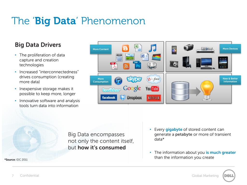 The ‘Big Data’ Phenomenon • Big Data Drivers • The proliferation of data capture and creation technologies • Increased “interconnectedness” drives consumption (creating more data) • Inexpensive storage makes it possible to keep more, longer • Innovative software and analysis tools turn data into information More Consumption More Devices New & Better Information More Content • Every gigabyteof stored content can generate apetabyte or more of transient data* • The information about you is much greater than the information you create Big Data encompasses not only the content itself, but how it’s consumed *Source: IDC 2011 Confidential