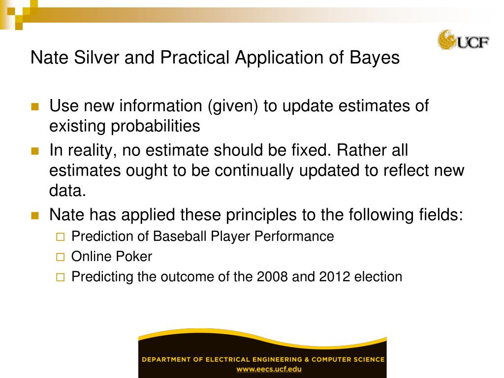 Nate Silver and Practical Application of Bayes • Use new information (given) to update estimates of existing probabilities • In reality, no estimate should be fixed. Rather all estimates ought to be continually updated to reflect new data. • Nate has applied these principles to the following fields: • Prediction of Baseball Player Performance • Online Poker • Predicting the outcome of the 2008 and 2012 election