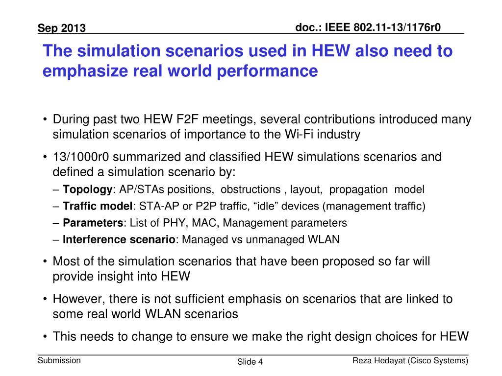 The simulation scenarios used in HEW also need to emphasize real world performance • During past two HEW F2F meetings, several contributions introduced many simulation scenarios of importance to the Wi-Fi industry • 13/1000r0 summarized and classified HEW simulations scenarios and defined a simulation scenario by: • Topology: AP/STAs positions, obstructions , layout, propagation model • Traffic model: STA-AP or P2P traffic, “idle” devices (management traffic) • Parameters: List of PHY, MAC, Management parameters • Interference scenario: Managed vs unmanaged WLAN • Most of the simulation scenarios that have been proposed so far will provide insight into HEW • However, there is not sufficient emphasis on scenarios that are linked to some real world WLAN scenarios • This needs to change to ensure we make the right design choices for HEW