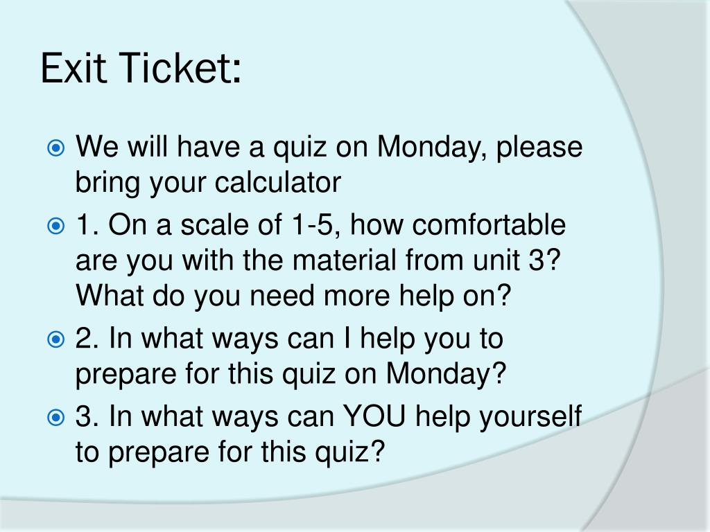Exit Ticket: • We will have a quiz on Monday, please bring your calculator • 1. On a scale of 1-5, how comfortable are you with the material from unit 3? What do you need more help on? • 2. In what ways can I help you to prepare for this quiz on Monday? • 3. In what ways can YOU help yourself to prepare for this quiz?
