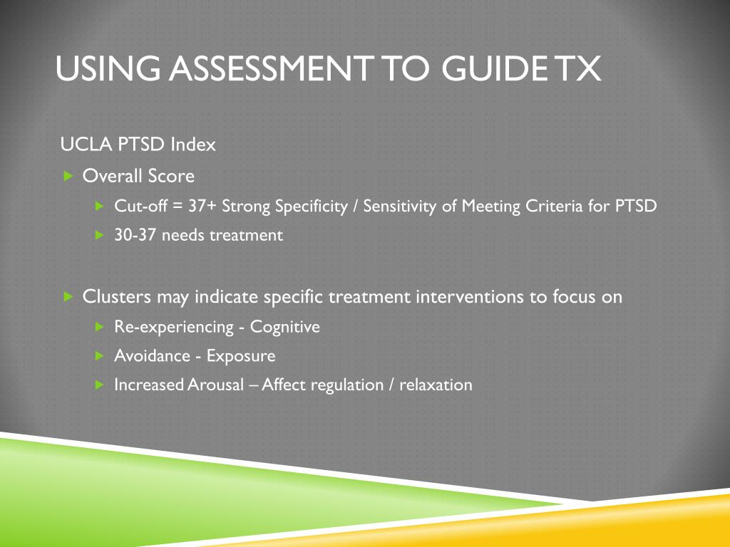Using Assessment to Guide tx UCLA PTSD Index • Overall Score • Cut-off = 37+ Strong Specificity / Sensitivity of Meeting Criteria for PTSD • 30-37 needs treatment • Clusters may indicate specific treatment interventions to focus on • Re-experiencing - Cognitive • Avoidance - Exposure • Increased Arousal – Affect regulation / relaxation
