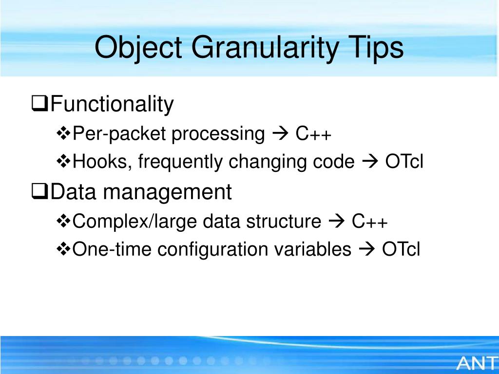 Object Granularity Tips • Functionality • Per-packet processing C++ • Hooks, frequently changing code OTcl • Data management • Complex/large data structure C++ • One-time configuration variables OTcl