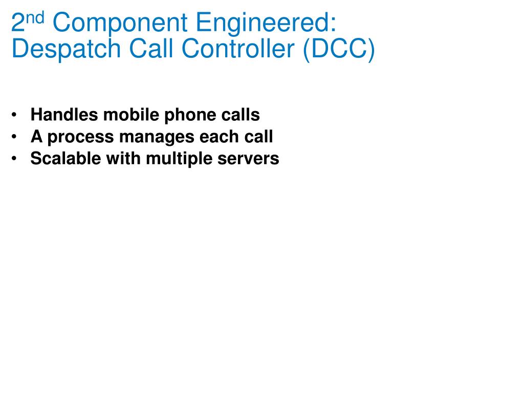 2nd Component Engineered: Despatch Call Controller (DCC) Handles mobile phone calls A process manages each call Scalable with multiple servers