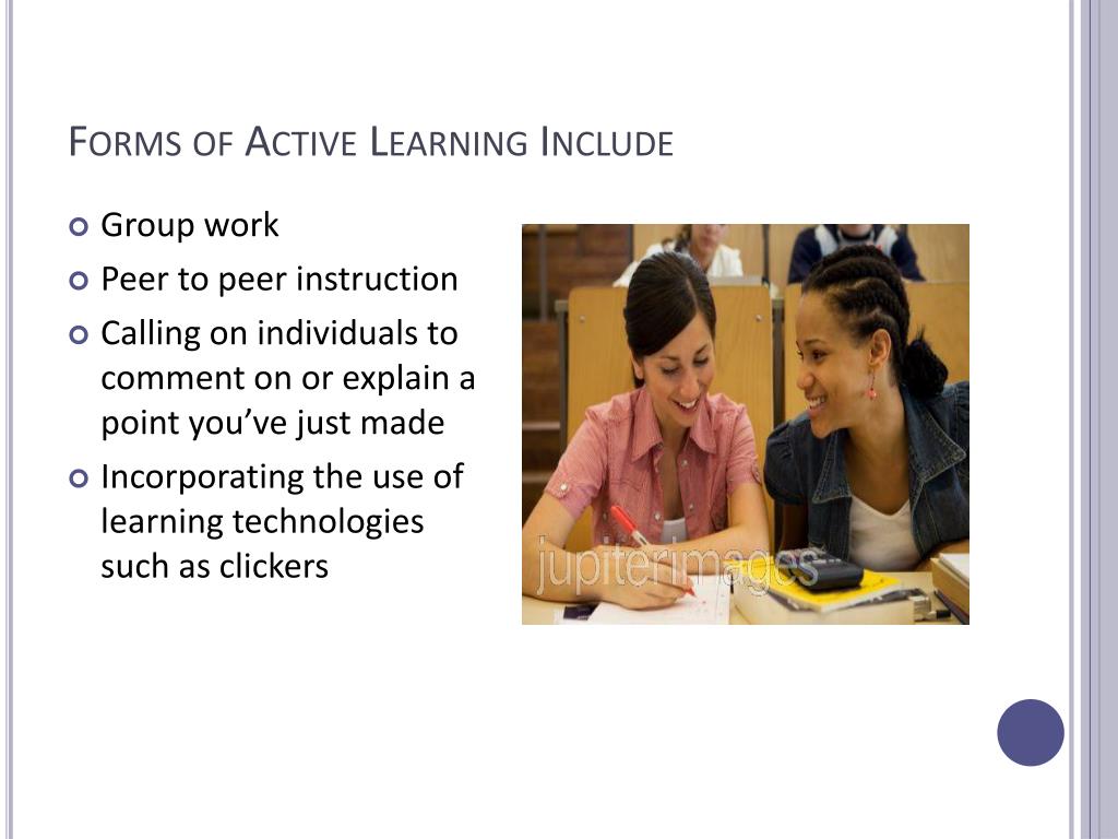 Forms of Active Learning Include • Group work • Peer to peer instruction • Calling on individuals to comment on or explain a point you’ve just made • Incorporating the use of learning technologies such as clickers