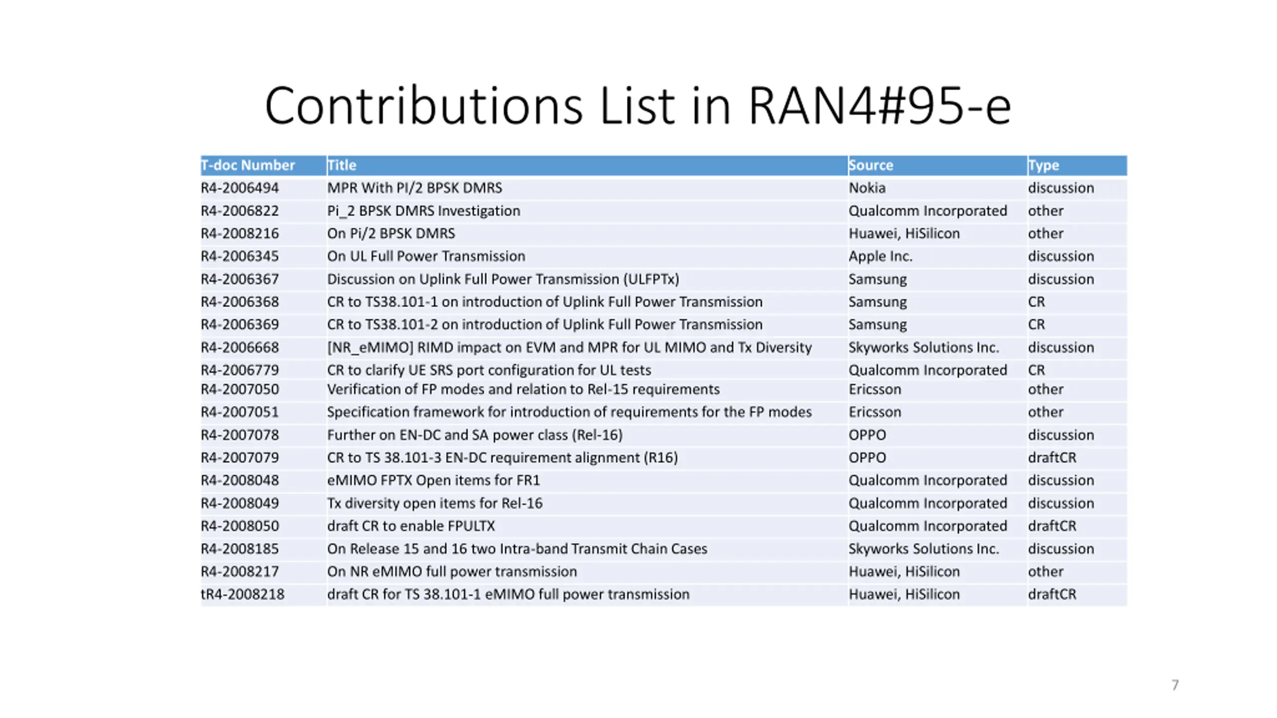 7. Contributions List in RAN4#95-e T-doc Number R4-2006494 R4-2006822 R4-2008216 R4-2006345 R4-2006367 R4-2006368 R4-2006369 R4-2006668 R4-2006779 R4-2007050 R4-2007051 R4-2007078 R4-2007079 R4-2008048 R4-2008049 R4-2008050 R4-2008185 R4-2008217 tR4-2008218 Title MPR With PI/2 BPSK DMRS Pi_2 BPSK DMRS Investigation On Pi/2 BPSK DMRS On UL Full Power Transmission Discussion on Uplink Full Power Transmission (ULFPTx) CR to TS38.101-1 on introduction of Uplink Full Power Transmission CR to TS38.101-2 on introduction of Uplink Full Power Transmission [NR_eMIMO] RIMD impact on EVM and MPR for UL MIMO and Tx Diversity CR to clarify UE SRS port configuration for UL tests Verification of FP modes and relation to Rel-15 requirements Specification framework for introduction of requirements for the FP modes Further on EN-DC and SA power class (Rel-16) CR to TS 38.101-3 EN-DC requirement alignment (R16) eMIMO FPTX Open items for FR1 Tx diversity open items for Rel-16 draft CR to enable FPULTX On Release 15 and 16 two Intra-band Transmit Chain Cases On NR eMIMO full power transmission draft CR for TS 38.101-1 eMIMO full power transmission Source Nokia Qualcomm Incorporated Huawei, HiSilicon Apple Inc. Samsung Samsung Samsung Skyworks Solutions Inc. Qualcomm Incorporated Ericsson Ericsson OPPO OPPO Qualcomm Incorporated Qualcomm Incorporated Qualcomm Incorporated Skyworks Solutions Inc. Huawei, HiSilicon Huawei, HiSilicon Type discussion other other discussion discussion CR CR discussion CR other other discussion draftCR discussion discussion draftCR discussion other draftCR 7