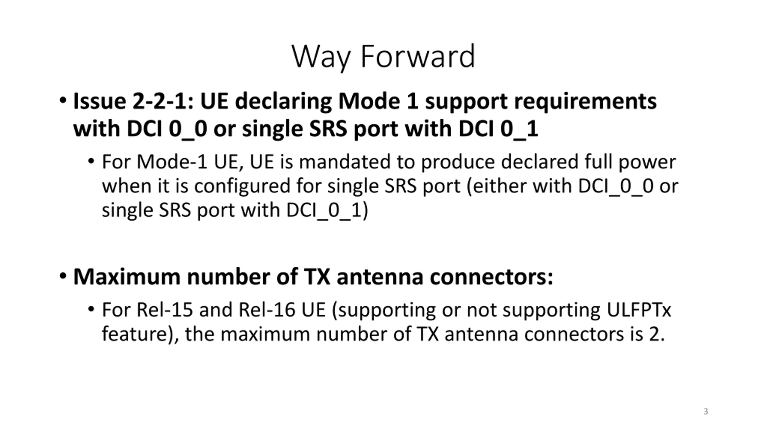 3. Way Forward • Issue 2-2-1: UE declaring Mode 1 support requirements with DCI 0_0 or single SRS port with DCI 0_1 • For Mode-1 UE, UE is mandated to produce declared full power when it is configured for single SRS port (either with DCI_0_0 or single SRS port with DCI_0_1) • Maximum number of TX antenna connectors: • For Rel-15 and Rel-16 UE (supporting or not supporting ULFPTx feature), the maximum number of TX antenna connectors is 2. 3