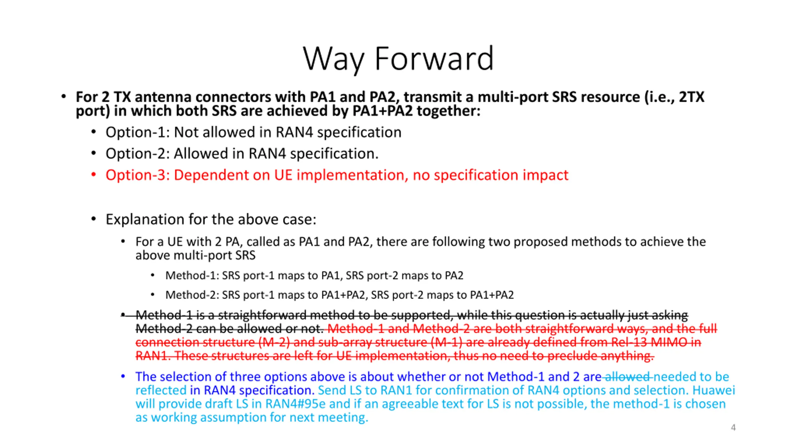 4. Way Forward • For 2 TX antenna connectors with PA1 and PA2, transmit a multi-port SRS resource (i.e., 2TX port) in which both SRS are achieved by PA1+PA2 together: • Option-1: Not allowed in RAN4 specification • Option-2: Allowed in RAN4 specification. • Option-3: Dependent on UE implementation, no specification impact • Explanation for the above case: • For a UE with 2 PA, called as PA1 and PA2, there are following two proposed methods to achieve the above multi-port SRS • Method-1: SRS port-1 maps to PA1, SRS port-2 maps to PA2 • Method-2: SRS port-1 maps to PA1+PA2, SRS port-2 maps to PA1+PA2 • Method-1 is a straightforward method to be supported, while this question is actually just asking Method-2 can be allowed or not. Method-1 and Method-2 are both straightforward ways, and the full connection structure (M-2) and sub-array structure (M-1) are already defined from Rel-13 MIMO in RAN1. These structures are left for UE implementation, thus no need to preclude anything. • The selection of three options above is about whether or not Method-1 and 2 are allowed needed to be reflected in RAN4 specification. Send LS to RAN1 for confirmation of RAN4 options and selection. Huawei will provide draft LS in RAN4#95e and if an agreeable text for LS is not possible, the method-1 is chosen as working assumption for next meeting. 4