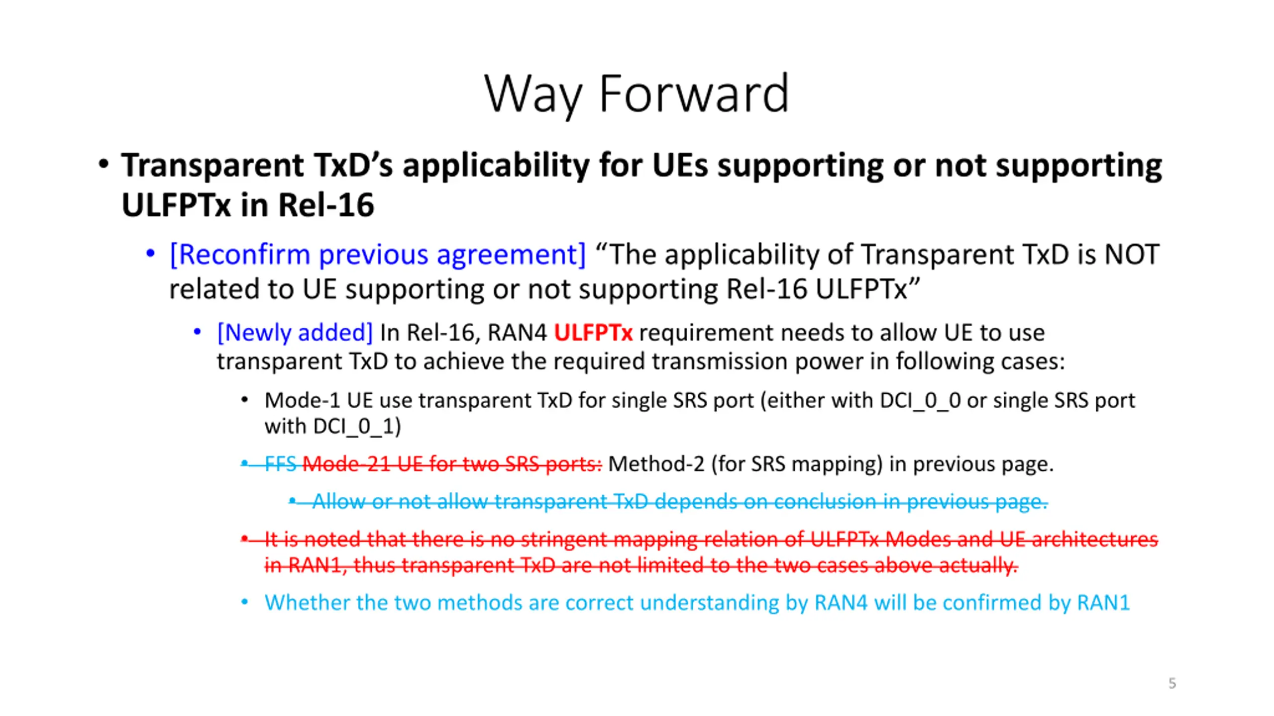 5. Way Forward • Transparent TxD’s applicability for UEs supporting or not supporting ULFPTx in Rel-16 • [Reconfirm previous agreement] “The applicability of Transparent TxD is NOT related to UE supporting or not supporting Rel-16 ULFPTx” • [Newly added] In Rel-16, RAN4 ULFPTx requirement needs to allow UE to use transparent TxD to achieve the required transmission power in following cases: • Mode-1 UE use transparent TxD for single SRS port (either with DCI_0_0 or single SRS port with DCI_0_1) • FFS Mode-21 UE for two SRS ports: Method-2 (for SRS mapping) in previous page. • Allow or not allow transparent TxD depends on conclusion in previous page. • It is noted that there is no stringent mapping relation of ULFPTx Modes and UE architectures in RAN1, thus transparent TxD are not limited to the two cases above actually. • Whether the two methods are correct understanding by RAN4 will be confirmed by RAN1 5