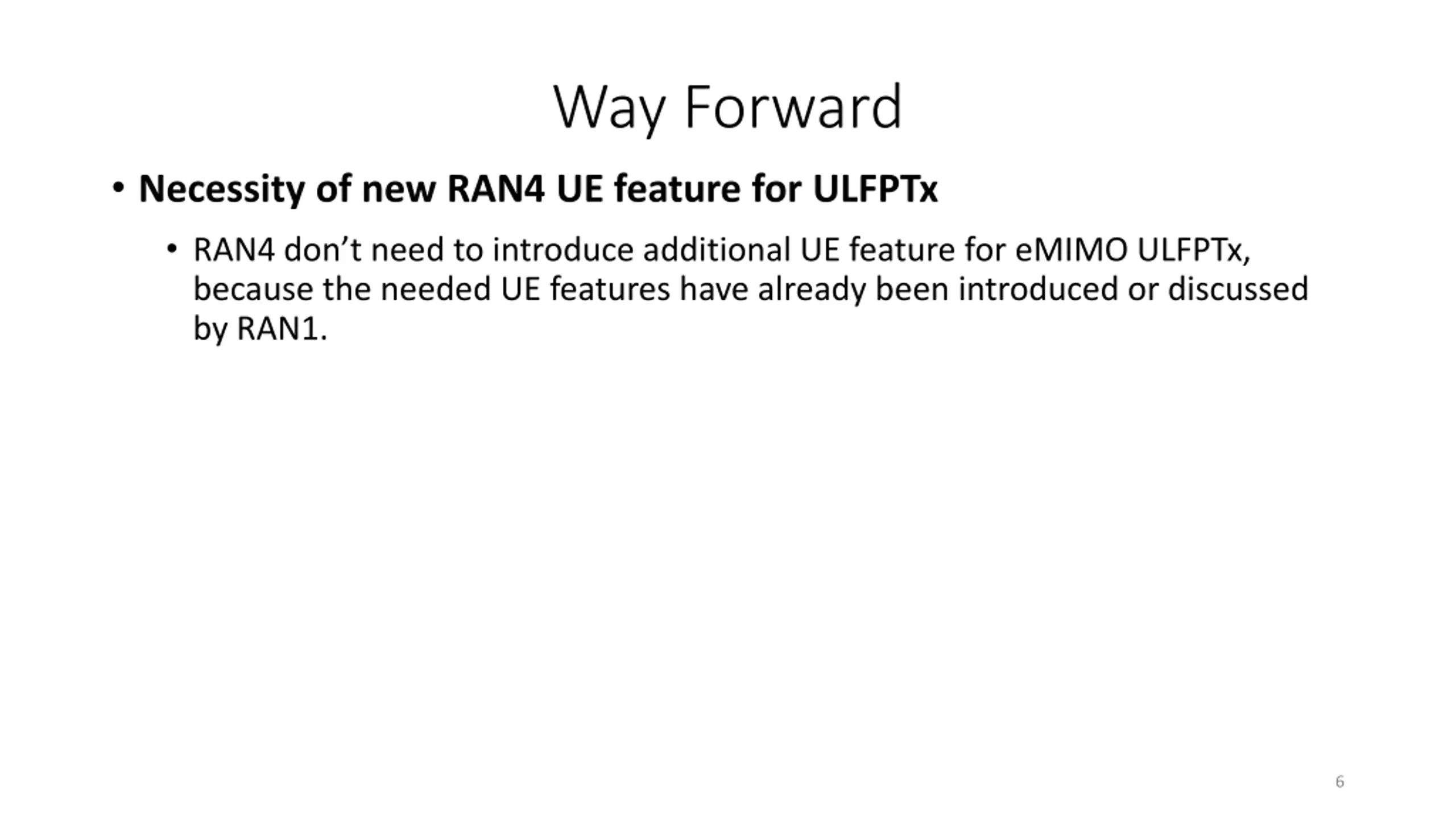 6. Way Forward • Necessity of new RAN4 UE feature for ULFPTx • RAN4 don’t need to introduce additional UE feature for eMIMO ULFPTx, because the needed UE features have already been introduced or discussed by RAN1. 6